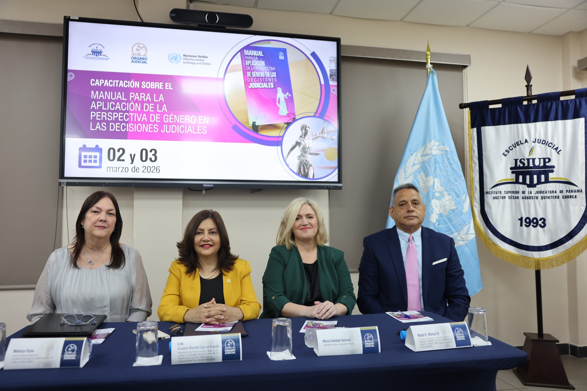 Hoy, 2 de marzo de 2026, se dio apertura a la jornada de capacitación sobre el “Manual para la Aplicación de la Perspectiva de Género en las Decisiones Judiciales”, actividad académica que se desarrolla los días 2 y 3 de marzo en modalidad presencial, en el Salón Taller de la Escuela Judicial Instituto Superior de la Judicatura de Panamá “Doctor César Augusto Quintero Correa” (ISJUP, en colaboración con la Oficina de las Naciones Unidas contra la Droga y el Delito (UNODC).