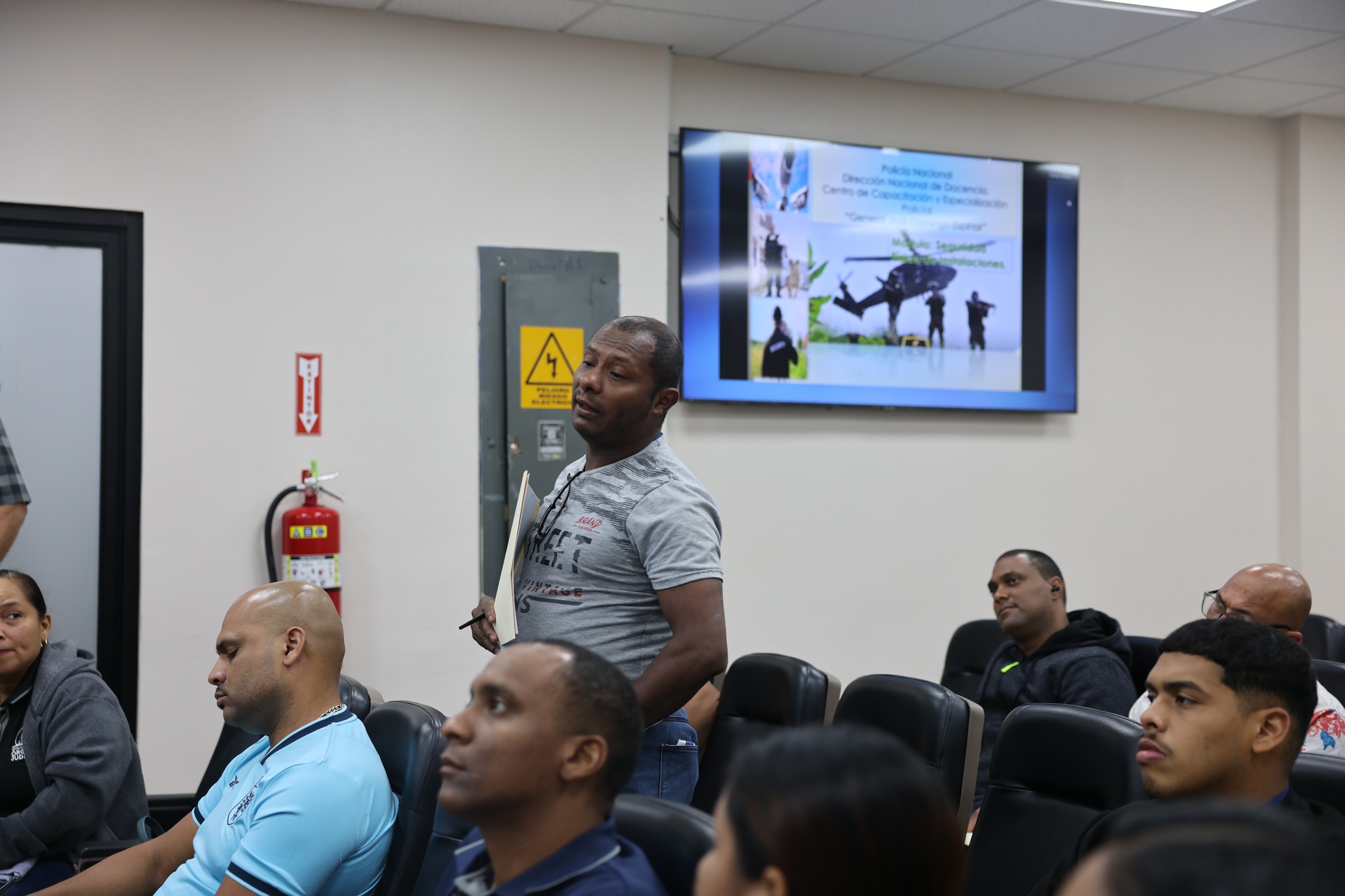 La jornada inició con los módulos Seguridad de Instalaciones I y II, facilitados por el Teniente Elton Santos, quien brindó las pautas y protocolos esenciales para la protección de espacios, identificación de riesgos, control de accesos y buenas prácticas en la gestión de seguridad.