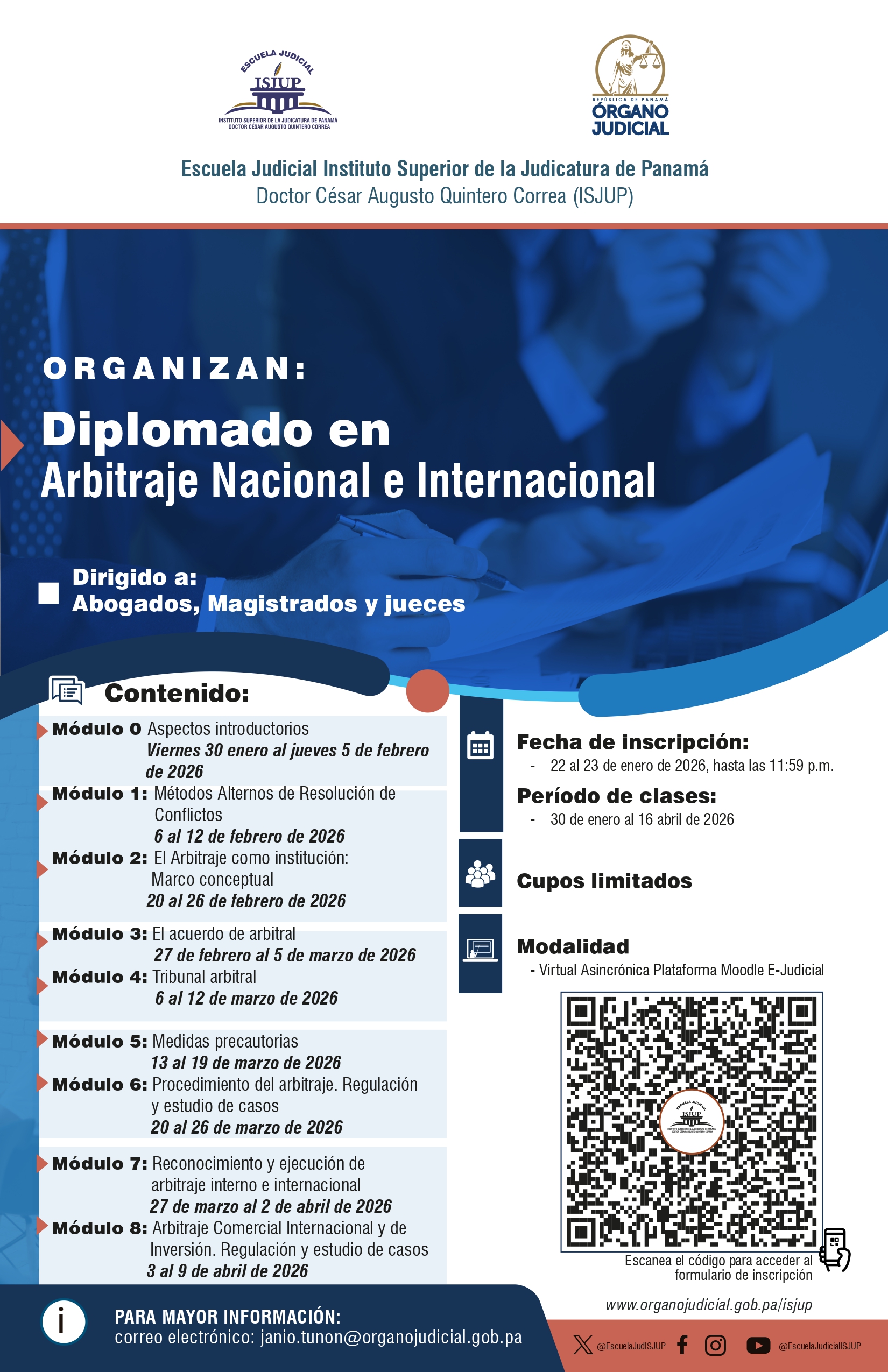 INSCRIBETE EN EL DIPLOMADO EN ARBITRAJE NACIONAL E INTERNACIONAL Publicado: 2026-01-21 16:44:16 Email Reproducir ENLACE DE INSCRIPCIONES