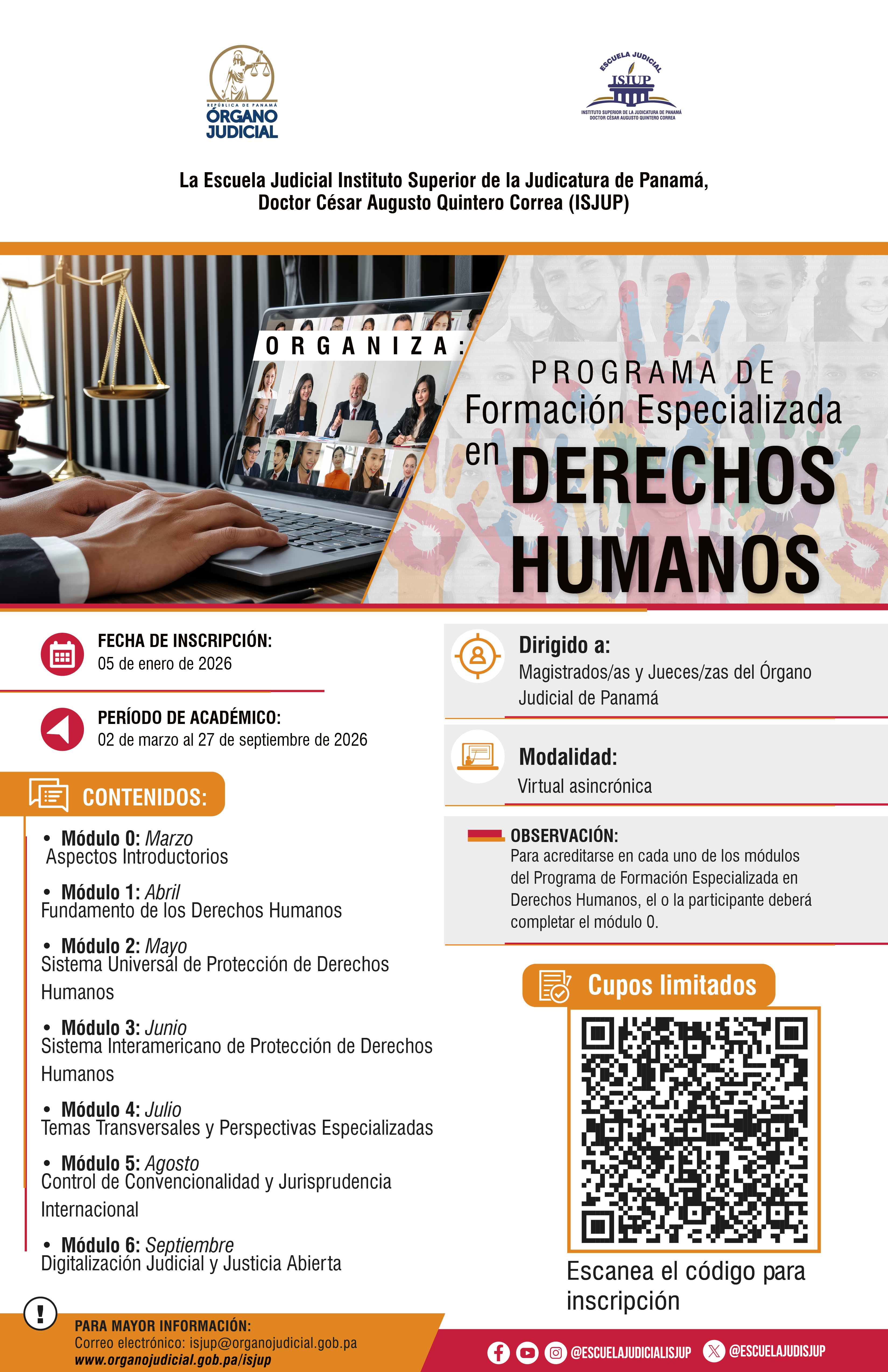 INSCRIBETE EN EL PROGRAMA DE FORMACIÓN ESPECIALIZADA EN DERECHOS HUMANOS Publicado: 2026-01-05 19:29:24 Email Reproducir ENLACE DE INSCRIPCIONES