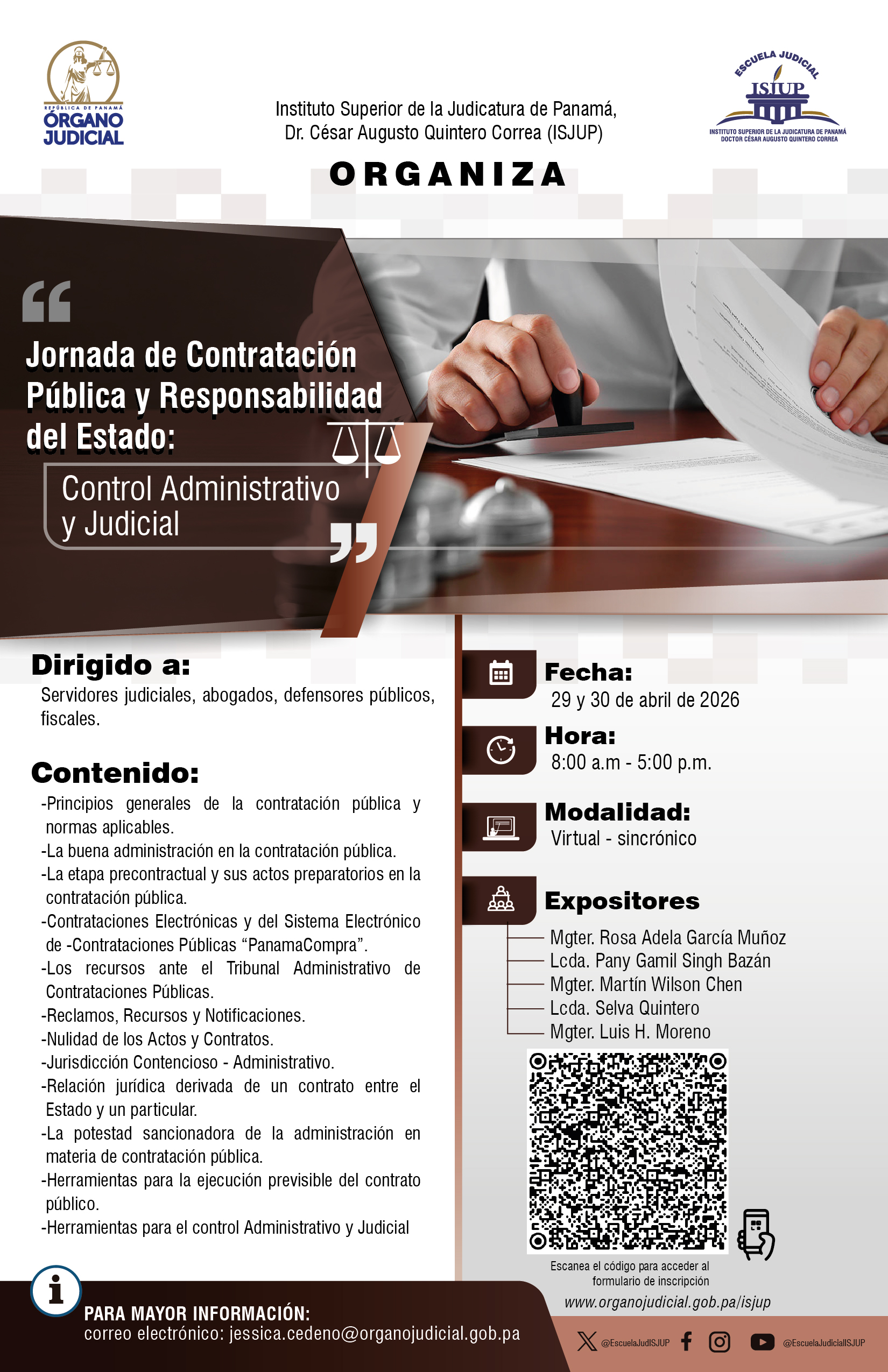 INSCRÍBETE EN LA JORNADA DE CONTRATACIÓN PÚBLICA Y RESPONSABILIDAD DEL ESTADO Publicado: 2026-04-23 16:41:51 Email Reproducir ENLACE DE INSCRIPCIONES