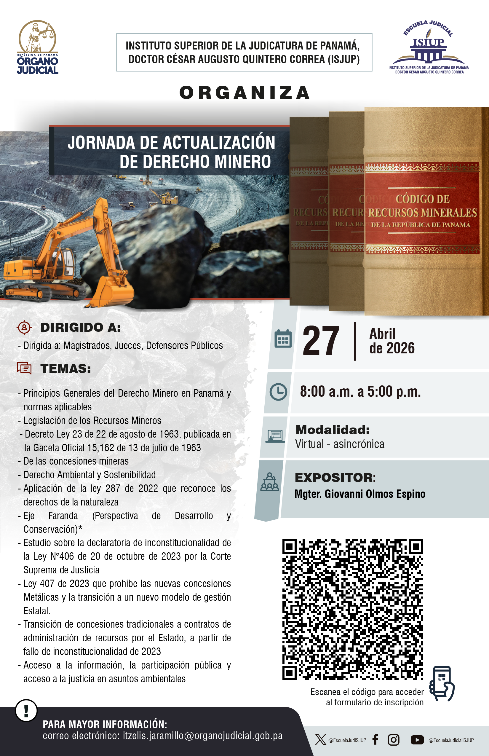 INSCRÍBETE EN LA JORNADA DE ACTUALIZACIÓN DE DERECHO MINERO Publicado: 2026-04-20 16:22:50 Email Reproducir Enlace de inscripción para el QR del Afiche Enlace de inscripción: https://forms.cloud.microsoft/Pages/ResponsePage.aspx?id=WMZnzF2z6U2jyRVTdjqLCRFx_xDXHVFBq38dueN4nrFUMVNESFpKMUlRVUxZVldNQkxFQUFTTFM1Ni4u&rd1bb05e55c1c4658978d38a1b1560226=%22JORNADA%20DE%20ACTUALIZACI%C3%93N%20DE%20DERECHO%20MINERO%22