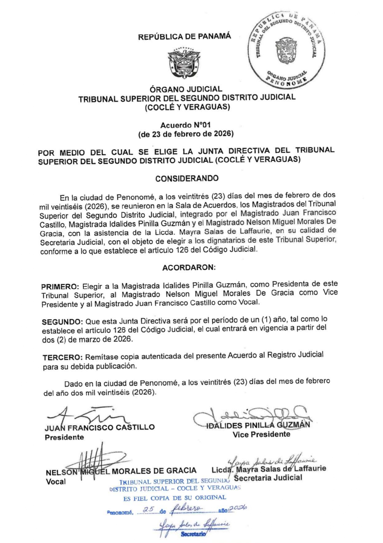 Acuerdo N° 1 de 23 de febrero de 2026 del Tribunal Superior del Segundo Distrito Judicial Publicado: 2026-02-25 14:23:02 Email Reproducir