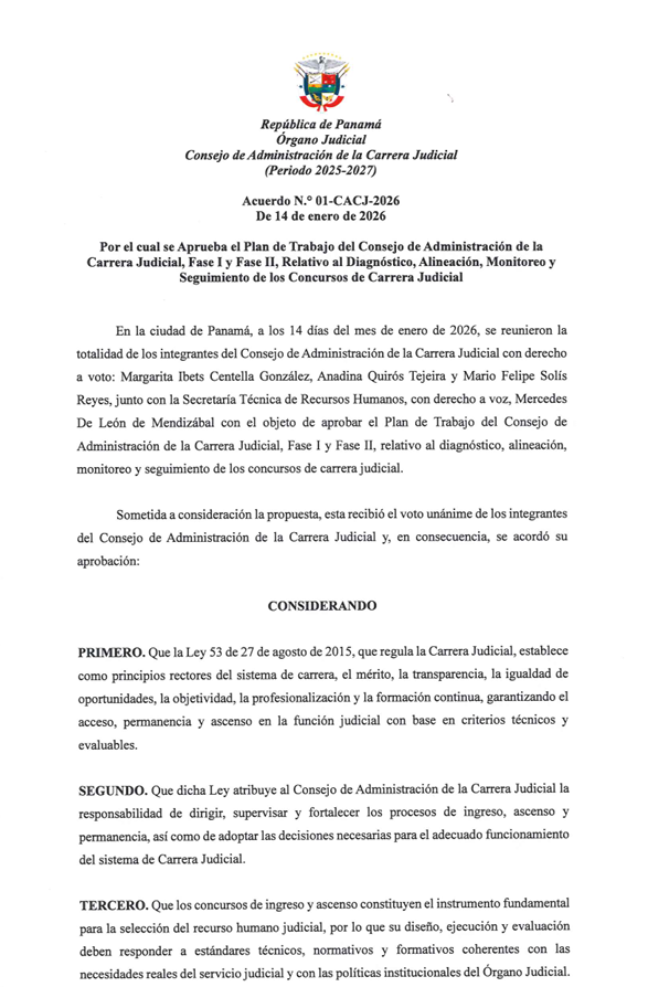 Acuerdo N.°01-CACJ-2026 de 14 de enero de 2026, por el cual se aprueba el Plan de Trabajo del CACJ Publicado: 2026-01-21 12:35:51 Email Reproducir En documentos adjuntos Acuerdo y Plan de Trabajo
