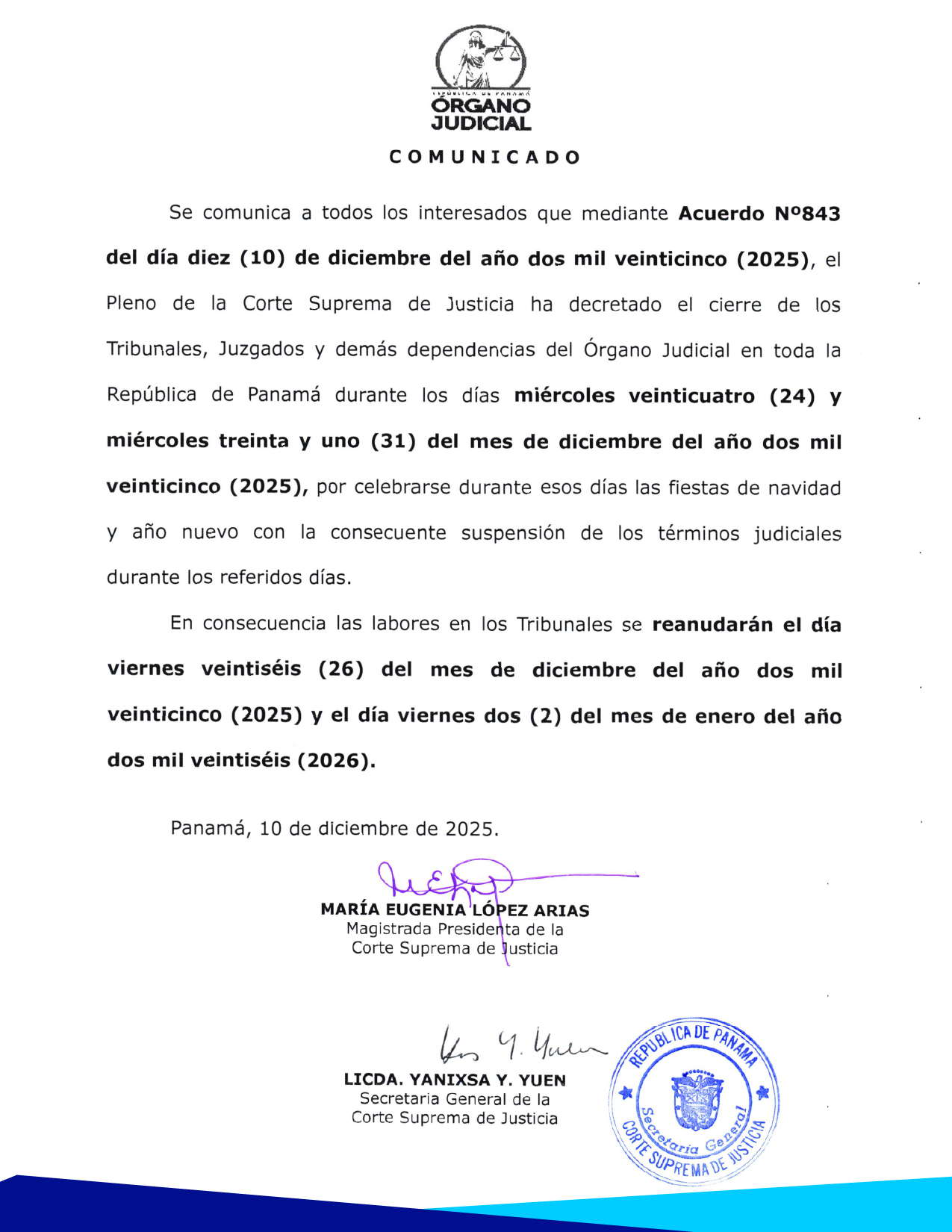 Comunicado Oficial sobre la Suspensión de Términos Judiciales los días 24 y 31 de diciembre de 2025 Publicado: 2025-12-11 14:10:57 Email Reproducir