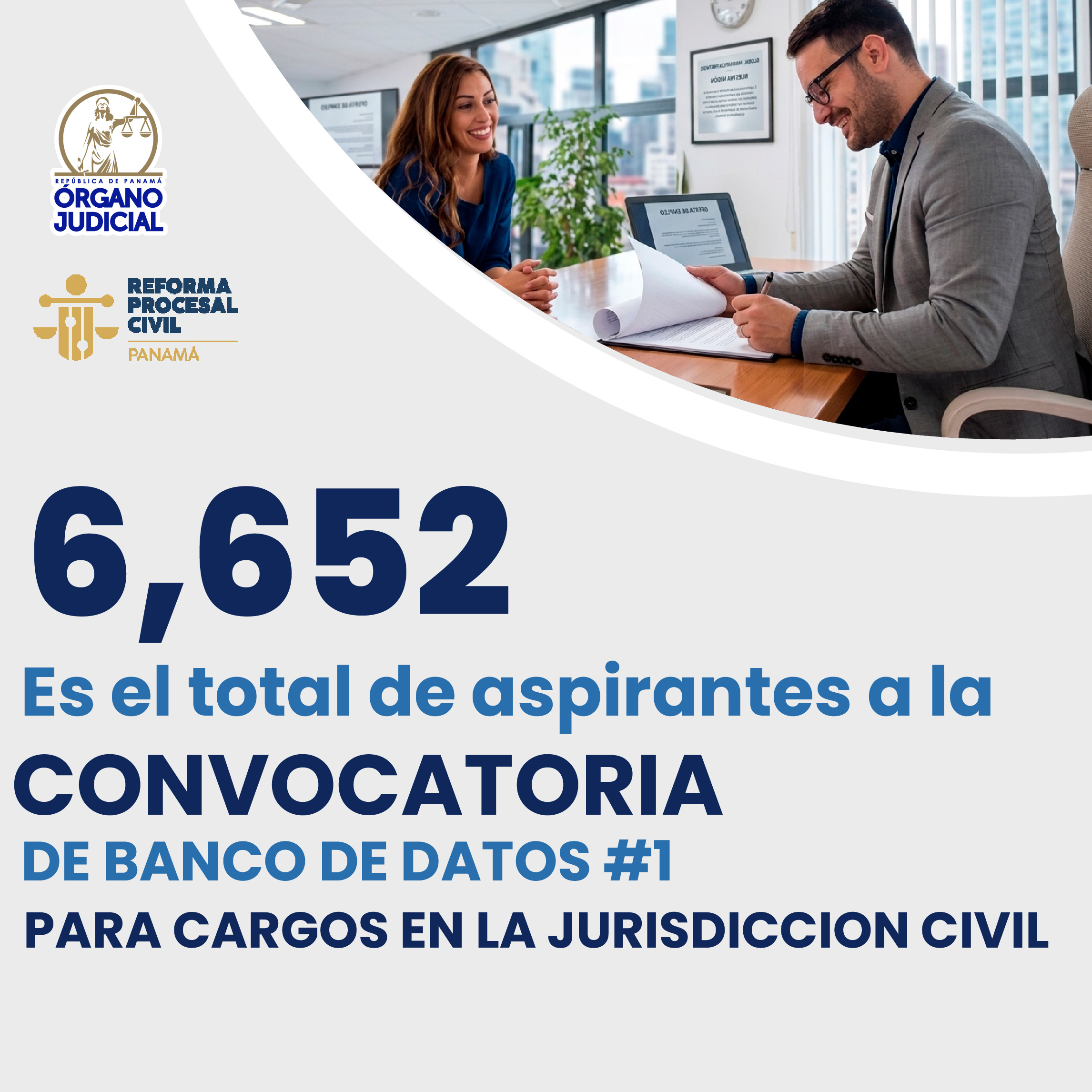 Un total de 6,652 aspirantes aplicaron a los diferentes cargos en la Jurisdicción Civil publicados a través de la Convocatoria No. 1 del Banco de Datos, que se dio durante el periodo de inscripción establecido del 6 al 15 de abril de 2026, para un total de 94 posiciones en distintas sedes a nivel nacional: Aguadulce, Chame, La Chorrera, Panamá, Penonomé y San Miguelito.