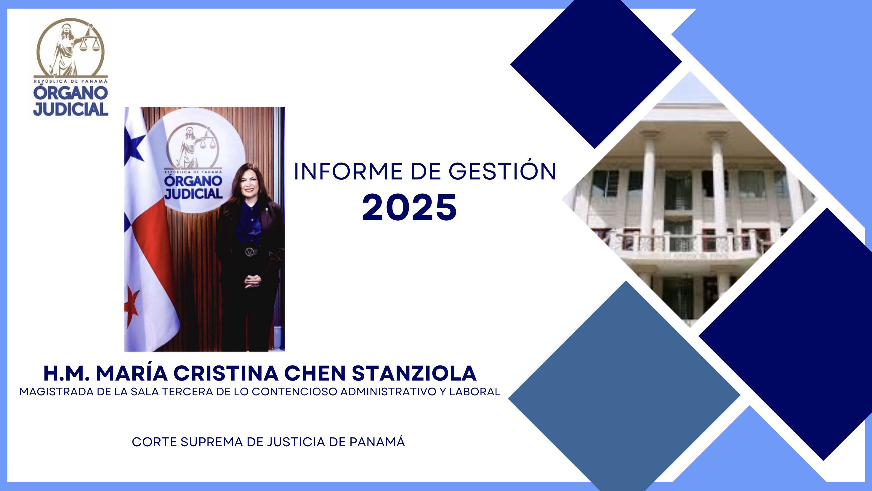 Informe de Gestión 2025 de la Honorable Magistrada de la Corte Suprema de Justicia María Cristina Chen Stanziola Publicado: 2026-01-21 09:52:06 Email Reproducir Para ver el Informe de Gestión 2025 dar clic aquí