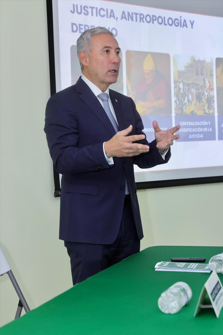 Durante su disertación, el Presidente de la Sala Primera de lo Civil inició su ponencia explicando los antecedentes de la justicia, la antropología y el derecho, además de los precedentes del Código Procesal Civil y el nuevo sistema de oralidad.