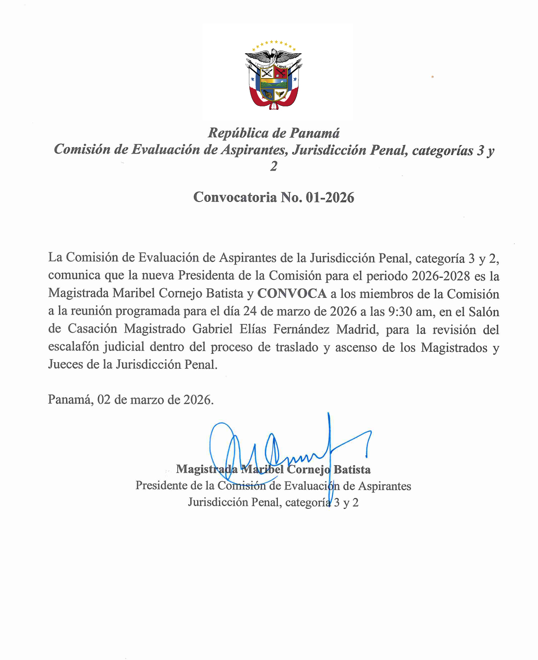 Magda. Cornejo Batista asume la presidencia de la Comisión de Evaluación de la Jurisdicción Penal y convoca a reunión Publicado: 2026-03-03 12:21:24 Email Reproducir