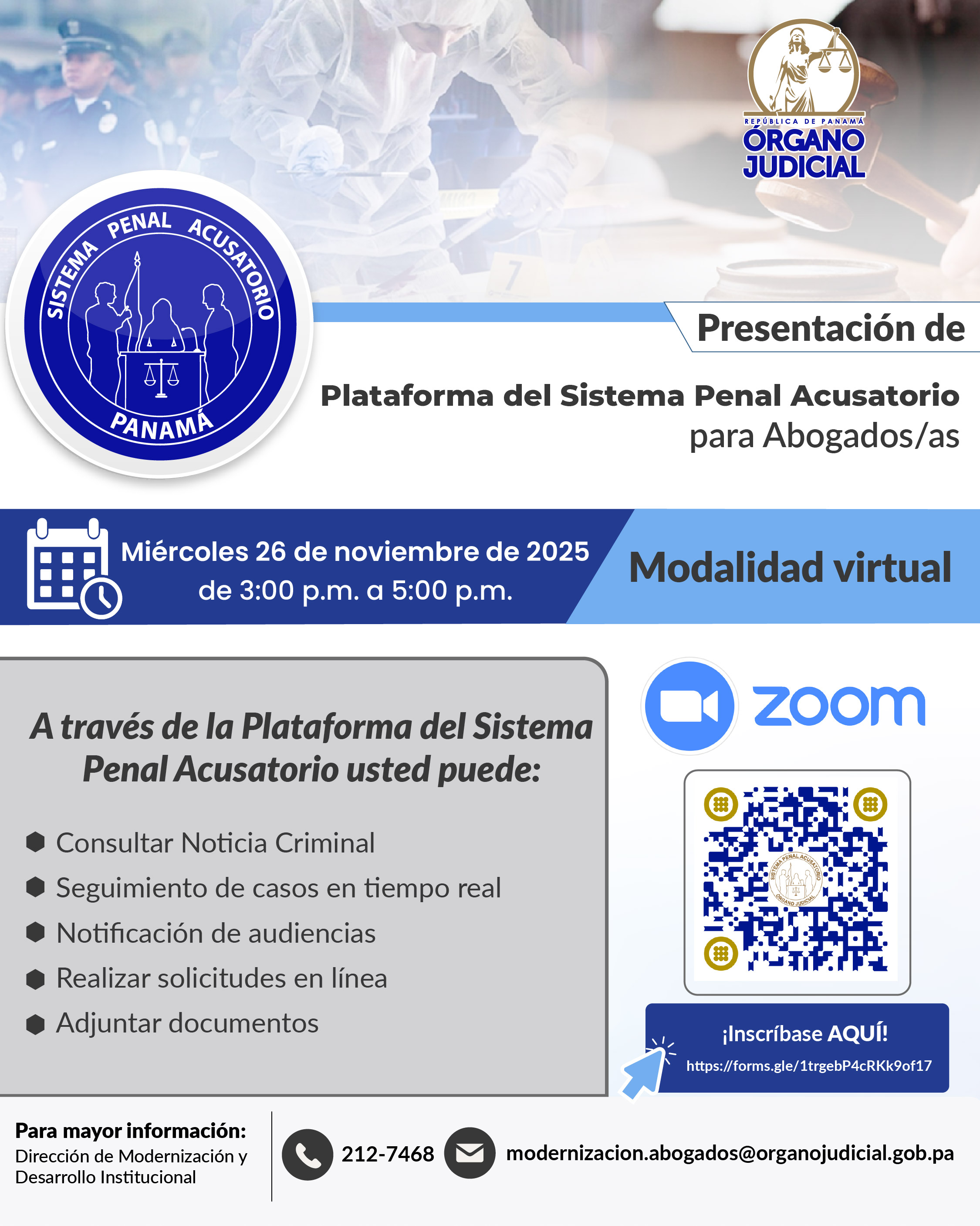 Presentación de Plataforma del Sistema Penal Acusatorio para abogados/as Publicado: 2025-11-20 11:27:38 Email Reproducir