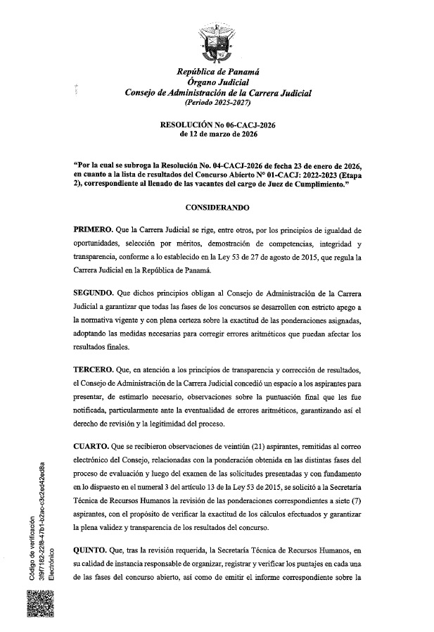 Resolución N°06-CACJ-2026, y su respectivo Edicto, del Consejo de Administración de la Carrera Judicial Publicado: 2026-03-13 15:29:57 Email Reproducir Para ver al completo Resolución N°06-CACJ-2026, dar clic aquí Para ver al completo Edicto N°06-CACJ-2026, dar clic aquí