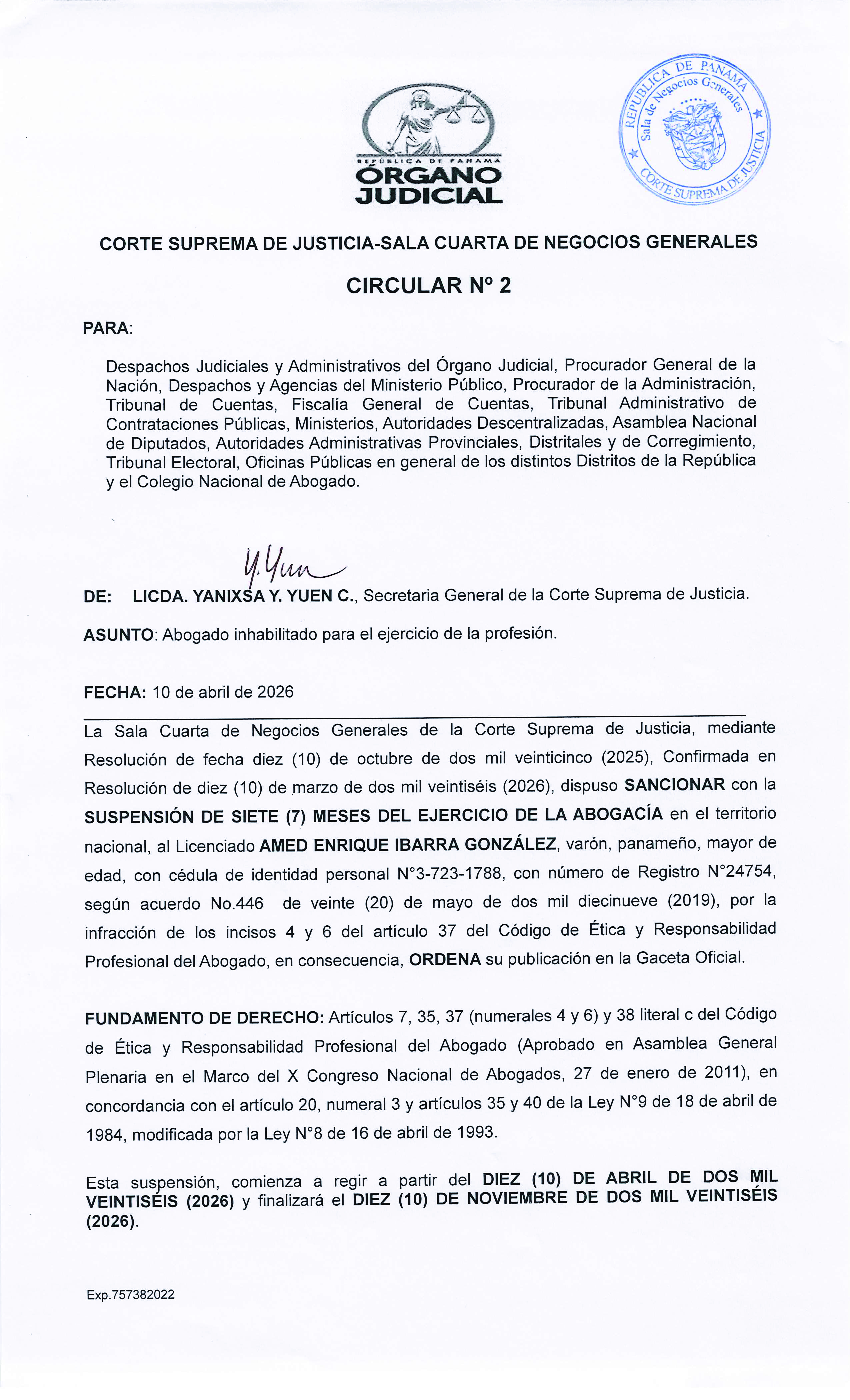 Sala 4ta. de Negocios Generales de la CSJ sanciona abogado y lo inhabilita para el ejercicio de la profesión por 7 meses Publicado: 2026-04-10 10:56:23 Email Reproducir Ver Circular N°2 en formato PDF aquí 👈