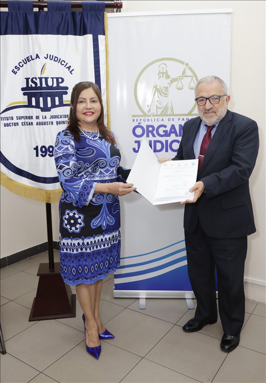En este tercer día de trabajo, le correspondió a la magistrada de la Sala Segunda de lo Penal de la Corte Suprema de Justicia y coordinadora ante el Pleno de la Unidad de Acceso a la Justicia y Género del Órgano Judicial, Ariadne Maribel García Angulo, junto al director de la Escuela Judicial del Instituto Superior de la Judicatura de Panamá (ISJUP), Raúl E. Olmos E., hacer entrega de los certificados de participación a la directora adjunta de RELAF, María Sánchez Brizuela, y al juez de la República Argentina, Luis Marcelo Giacoia.